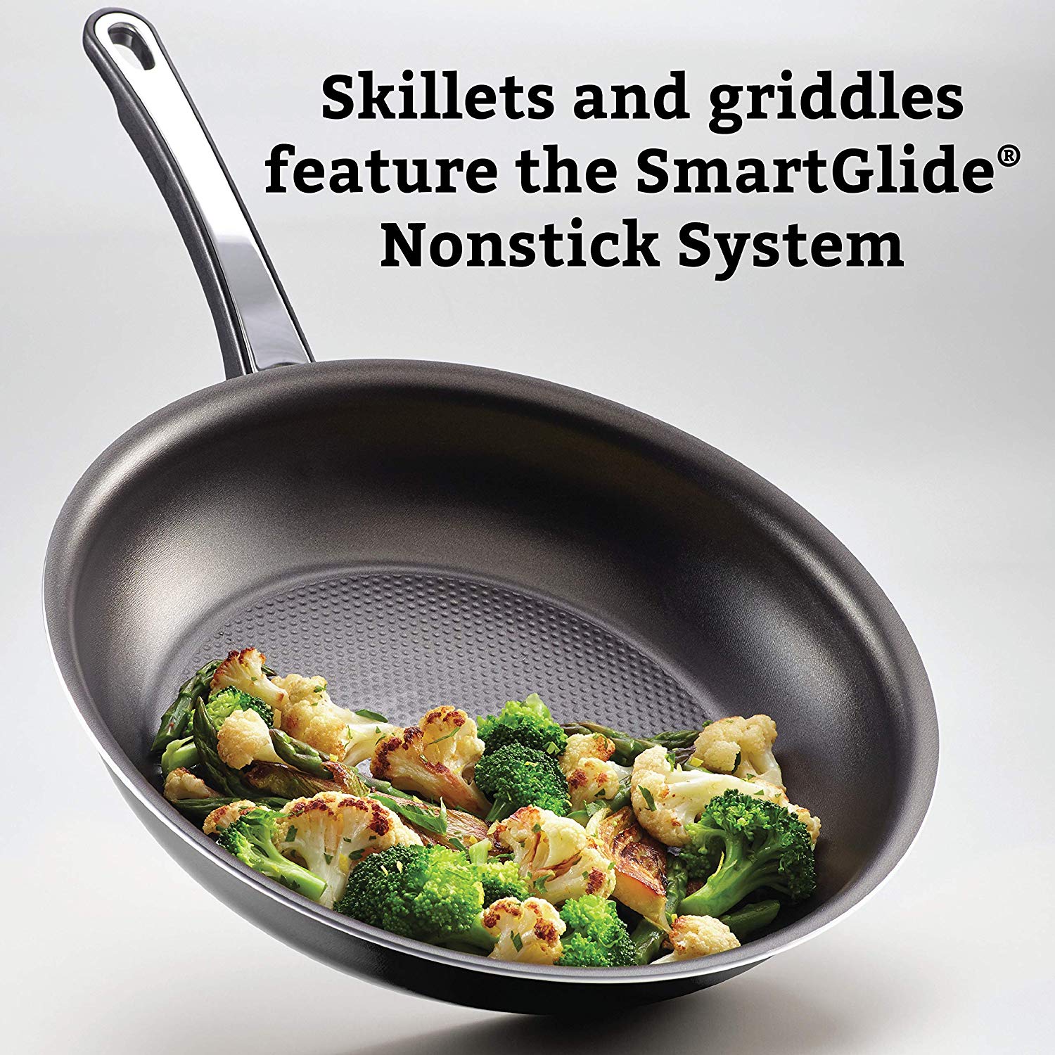 SmartGlide Nonstick SystemSkillets and griddle boast the unique dimpled surface of the SmartGlide(r) Nonstick System with top-quality nonstick which improves durability and creates air pockets that transfer heat to food quickly. |